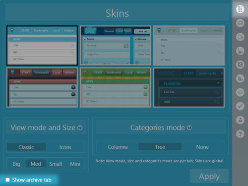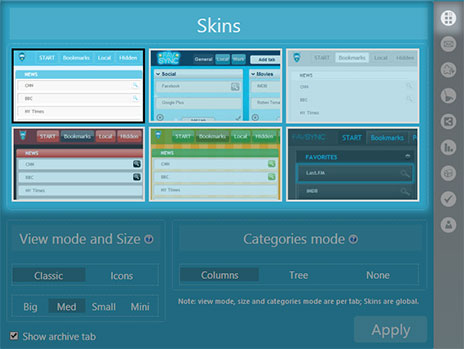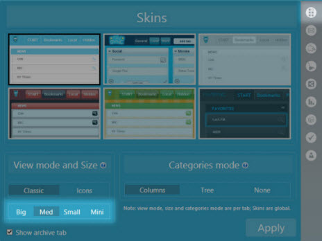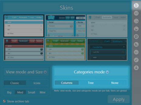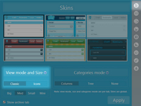 You can choose between six skins, two view modes, three categorization possibilities, four sizes and three sorting modes.