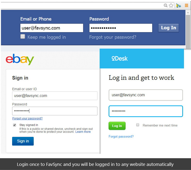 Login once to FavSync and afterwards you are automatically logged in to all the websites you use.